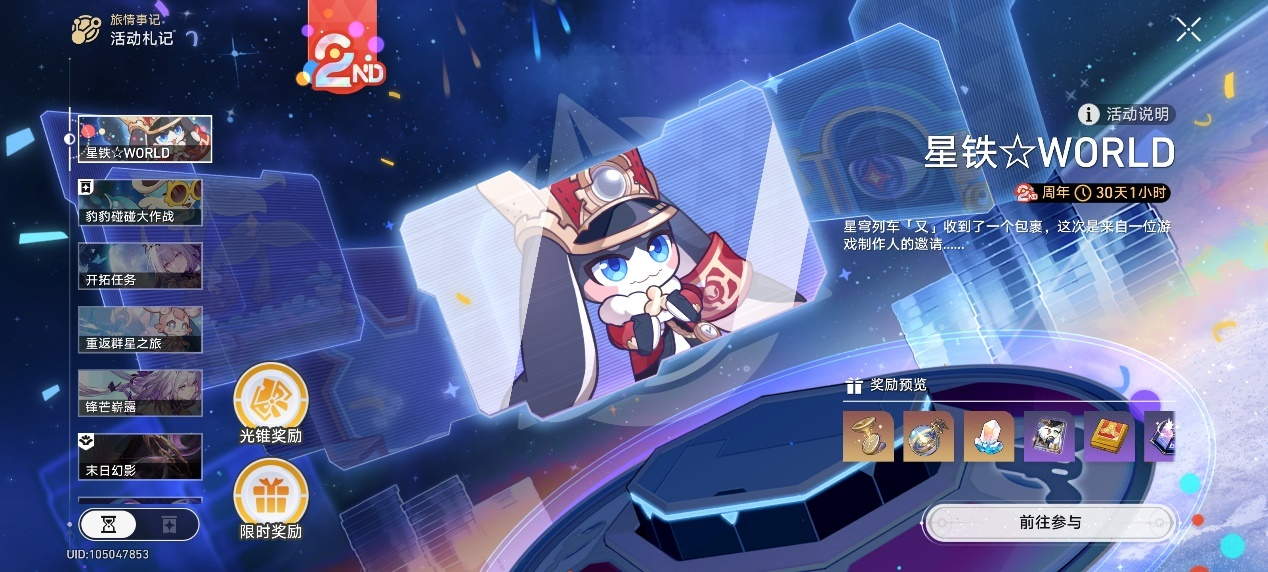- 常驻活动:崩铁每一次大版本更新都会新加入常驻活动,常驻活动通常以剧情/小游戏/战斗的方式进行,在新版本完成活动可以获得活动光锥(武器)。
