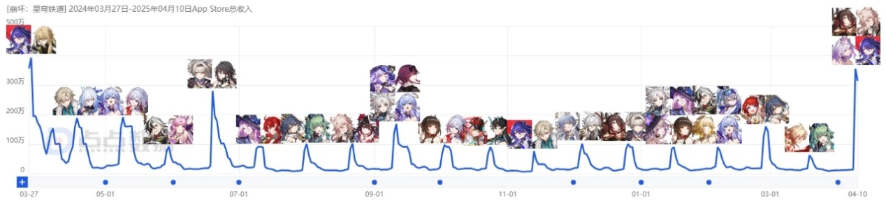 从以上数据分析得出,崩铁在2024年3月27日-2025年4月10日近1年的时间里,营收涨落趋于稳定,保持在版本更新时快速上涨,随时间自然回落。